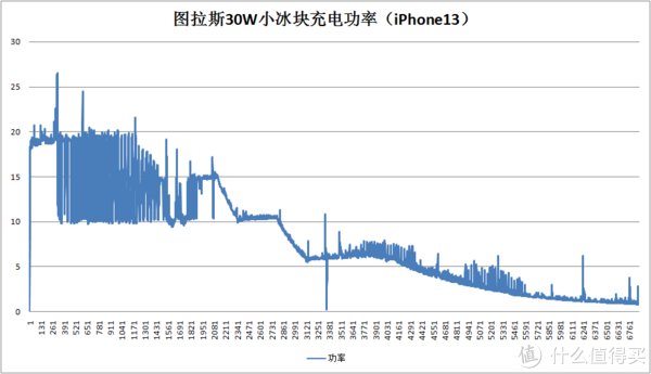 下图是iPhone13的实时功率曲线,前15分钟基本上都有19W左右功率,由于温度升到了47度,智能温控系统起作用,开始下调电流,降低功率到15W左右,充电第40分钟时,功率降到了10W左右,50分钟时降到5W左右,随后随着电池电量达到80%以上,为了保护电池,开始慢速模式,直到手机充满。