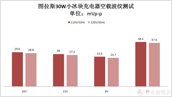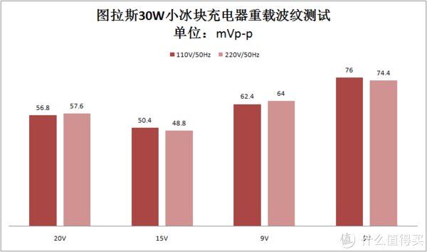 纹波数值越低,表明充电器的输出质量越高,图拉斯不管是空载还是重载,纹波数值都维持在一个相对较低的水平。